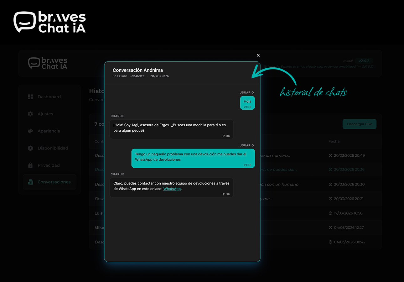 - Conversation history with CSV export: Browse all sessions from the WordPress dashboard and export them to your CRM, spreadsheet, or database with one click.